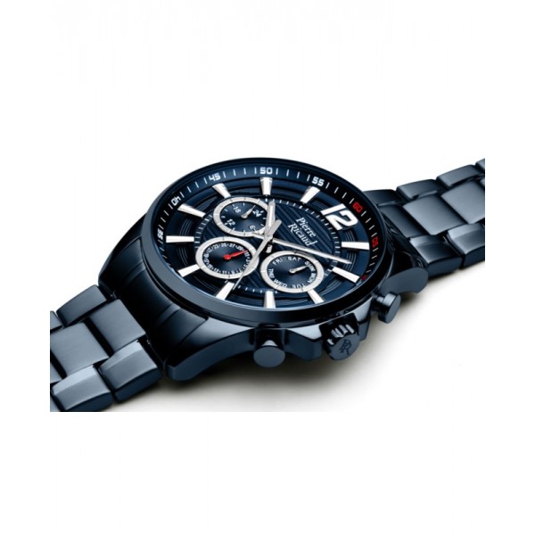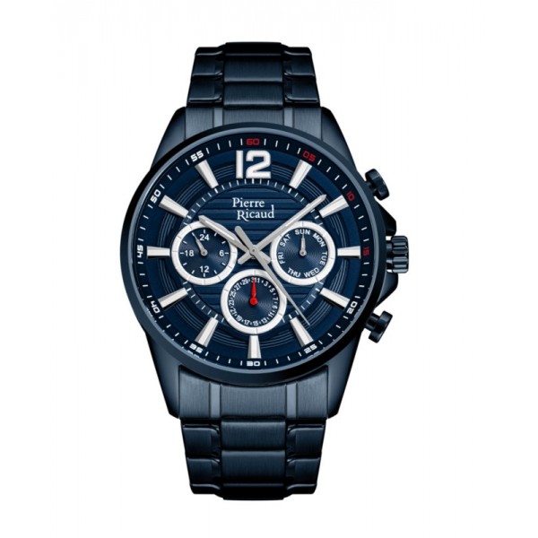 Męski stalowy granatowy analogowy okrągły multidata tarcza granatowa szkło mineralne bransoleta stalowa granatowa kwarc 5 ATM